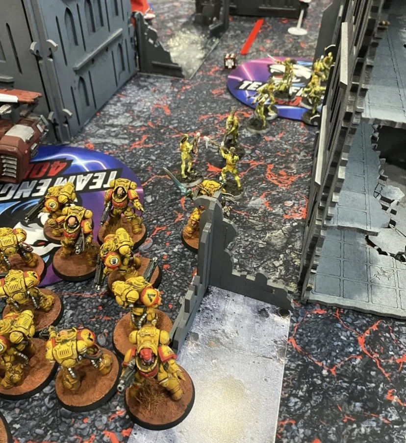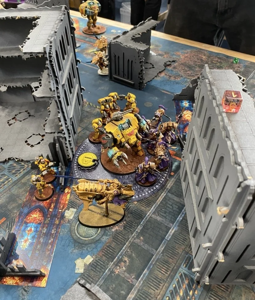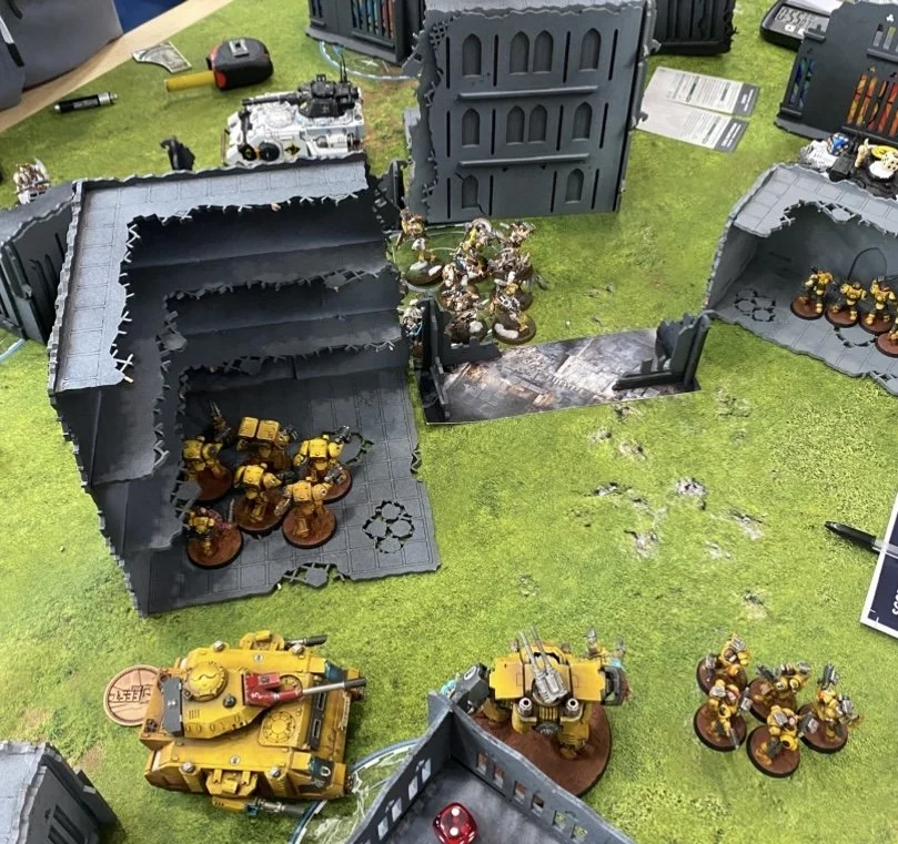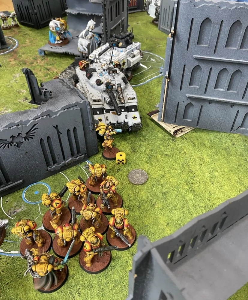 I made a couple of errors early, my opponent who was again very friendly and a really good sport pushed very aggressively and this caught me off guard and I ended up even retreating with some units. He used the Repulsors to bash forwards doing a lot of shooting but also claming the mid board and taking control by turn 2. I did genuinely get unlucky with the dice, he was making a lot of 5 and 6 up saves with his repulsors and 1 ballistus fired everything into 1 and missed every shot. A t one point the invictor was going to punch the repulsor to death and he needed to make 3, +5 saves out of 4 dice rolls and made it. These things would not have won me the game but they were big swings and cost me quite a lot of points (after the game he thought 15 points) I was getting flustered and tried taking on a repulsor with my heavy intercessors and charing in a unit of Temrinators, the tank was Oathed but it was a desperate move, when his Wulfen heroic’d into the Terminators, I made the terrible decision to still hit the tank and not the Wulfen. I ‘d become tunnel visioned and was being rocked by the space wolf power. Of course I didn’t destroy the tank and the 10 Wulfen then obliterated my terminators.
